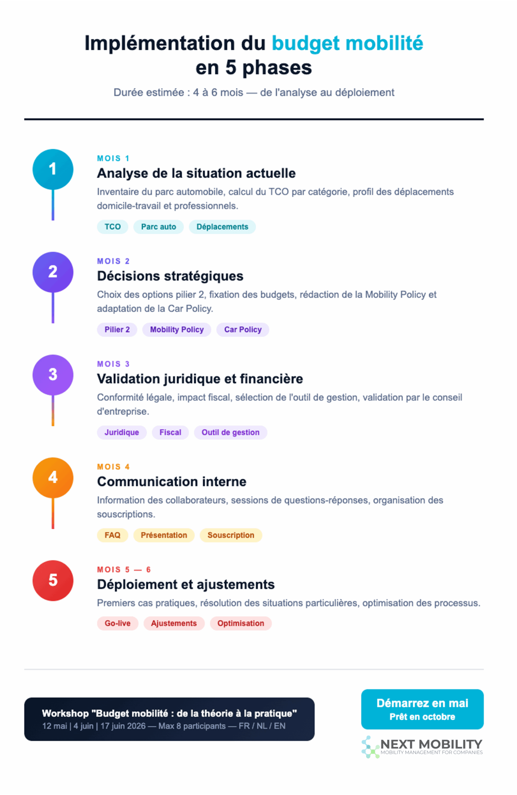 Phase 2 (mois 2) : décisions stratégiques — quelles options du pilier 2 activer, comment fixer les budgets, rédaction de la mobility policy et adaptation de la car policy si nécessaire.