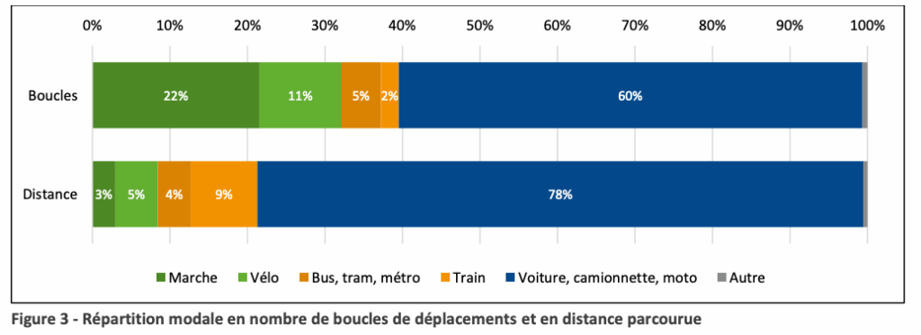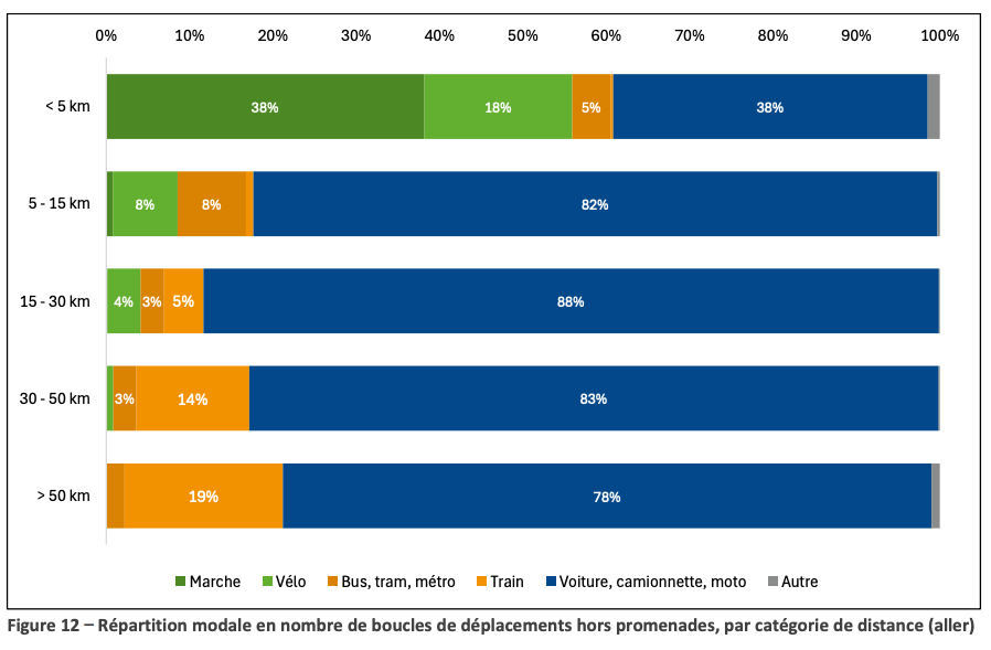 La voiture demeure le mode de déplacement principal pour 60 % des boucles et 78 % des kilomètres parcourus. Cette part est stable depuis 25 ans, malgré les efforts pour promouvoir des alternatives. Pour les trajets de 15 à 30 km, la voiture est quasi incontournable (88 % des boucles). Cette réalité pose un défi majeur pour les politiques de fleet management et la transition vers des solutions plus durables.