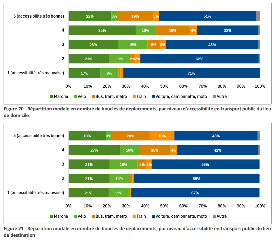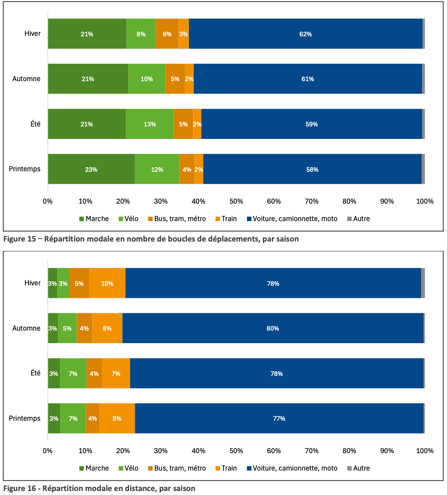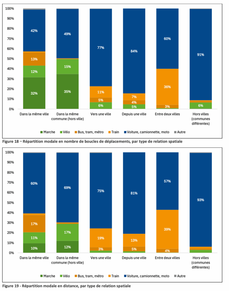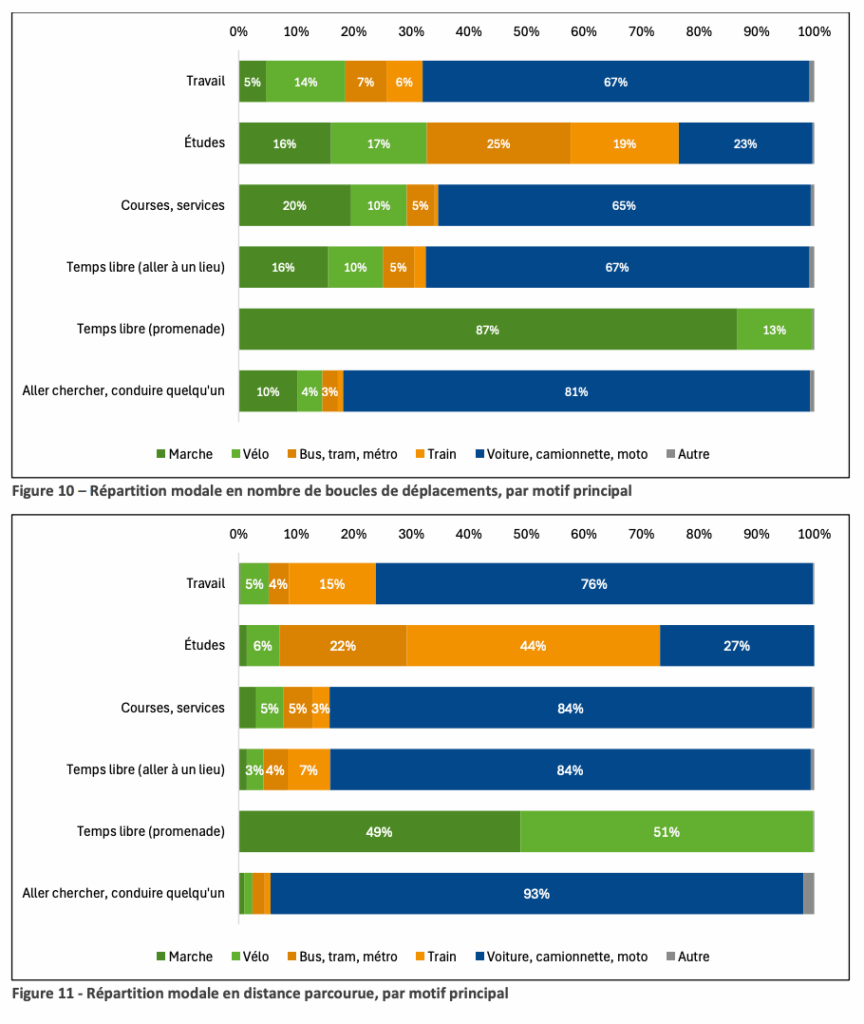 - Bruxelles : transports publics et marche dominent (20 % des km en métro/tram/bus, 6 % à pied).