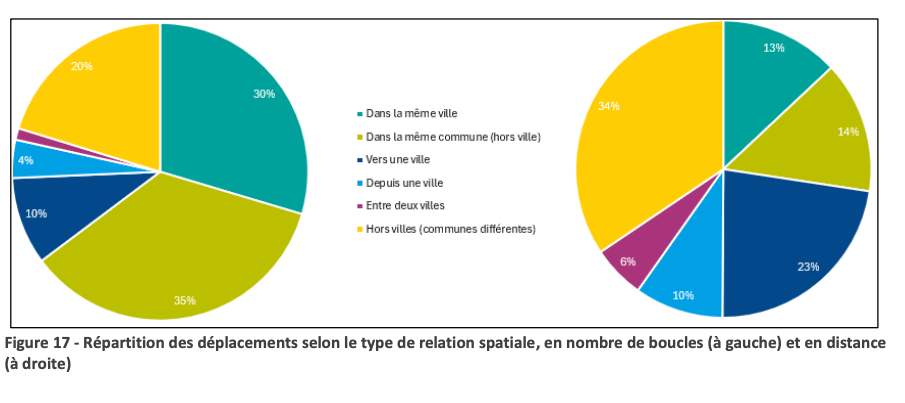 Les transports en commun représentent 7 % des boucles et 13 % des kilomètres. Le train est incontournable pour les trajets > 30 km (jusqu’à 19 % des boucles au-delà de 50 km). Mais son usage reste limité par l’accessibilité : dans les zones mal desservies, il est utilisé dans moins de 3 % des cas. Pour les entreprises, cela souligne l’importance d’intégrer l’accessibilité dans les plans de mobilité management.